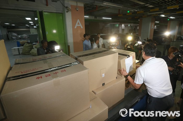 (서울=포커스뉴스) 10일 오후 서울 중구 소공동 롯데호텔에서 검찰 수사관들이 롯데그룹 정책본부 등 계열사와 신동빈 롯데그룹 회장 집무실에서 압수수색한 서류를 화물차에 싣고 있다.