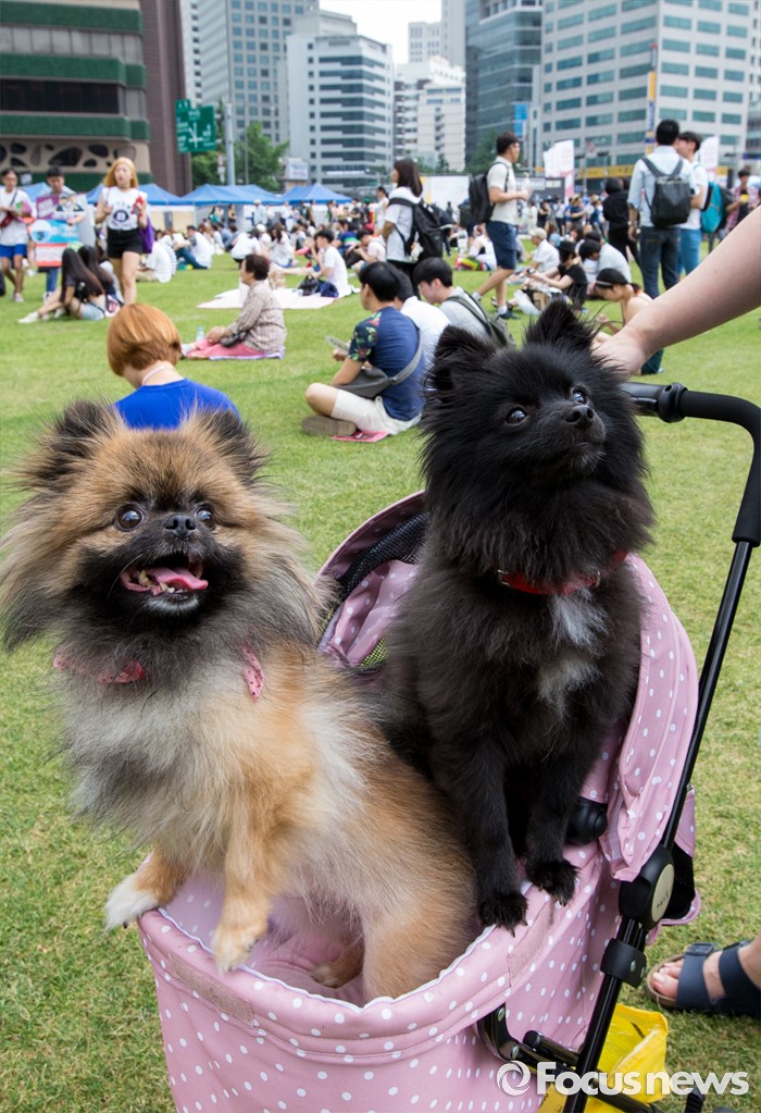 (서울=포커스뉴스) 11일 오후 서울광장에서 열린 제17회 퀴어문화축제에서 한 참가자가 애견과 함께 축제를 즐기고 있다.