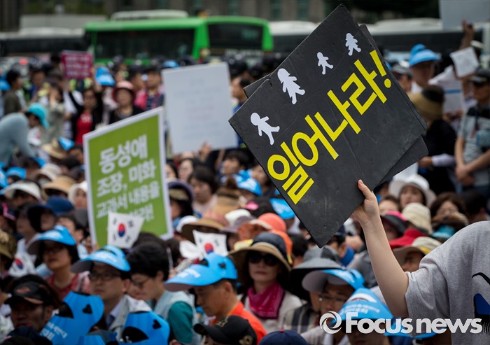 (서울=포커스뉴스) 11일 오후 서울 중구 대한문 앞에서 열린 '2016 서울광장 동성애축제 반대 국민대회'에서 참석자들이 동성애를 반대하는 손팻말을 들고 있다.