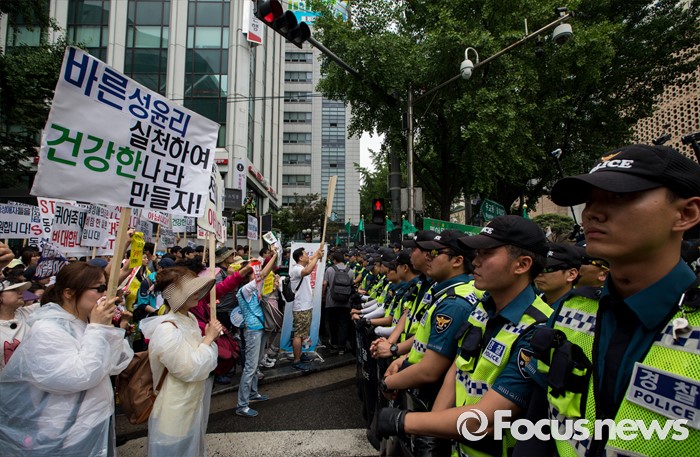 (서울=포커스뉴스) 11일 오후 제17회 퀴어문화축제 참가자들이 서울광장을 출발해 을지로일대를 지나며 퀴어퍼레이드를 벌이자 기독교인들이 이를 규탄하는 손팻말을 들고 경찰과 대치하고 있다.