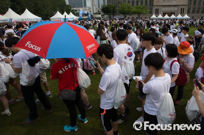 (서울=포커스뉴스) 12일 오전 서울 중구 서울시청 광장에서 열린 '제7회 나라사랑 고궁걷기 대회'에 시민들이 참가하고 있다.
