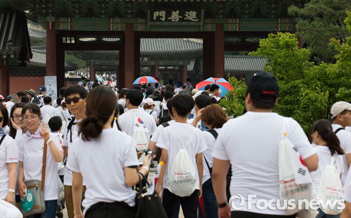 (서울=포커스뉴스) 12일 오전 서울 중구 서울시청 광장에서 열린 제 7회 나라사랑 고궁걷기 대회에 참가한 시민들이 창경궁을 향해 걷고 있다.