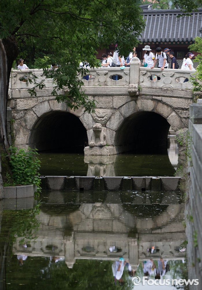 (서울=포커스뉴스) 12일 오전 서울 종로구 창덕궁에서 '제7회 나라사랑 고궁걷기 대회'에 참가한 시민들이 금천교를 둘러보고 있다.