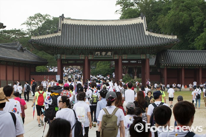 (서울=포커스뉴스) 12일 오전 서울 종로구 창덕궁에서 '제7회 나라사랑 고궁걷기 대회'에 참가한 시민들이 고궁을 둘러보며 걷고 있다.