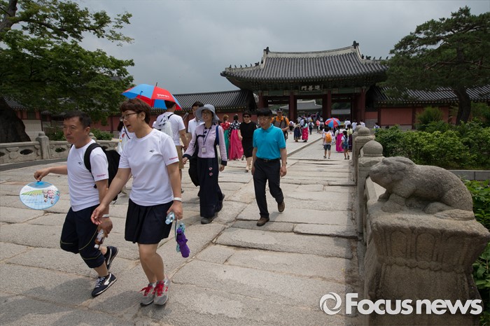 (서울=포커스뉴스) 12일 오전 서울 종로구 창덕궁에서 '제7회 나라사랑 고궁걷기 대회'에 참가한 시민들이 금천교를 건너고 있다.