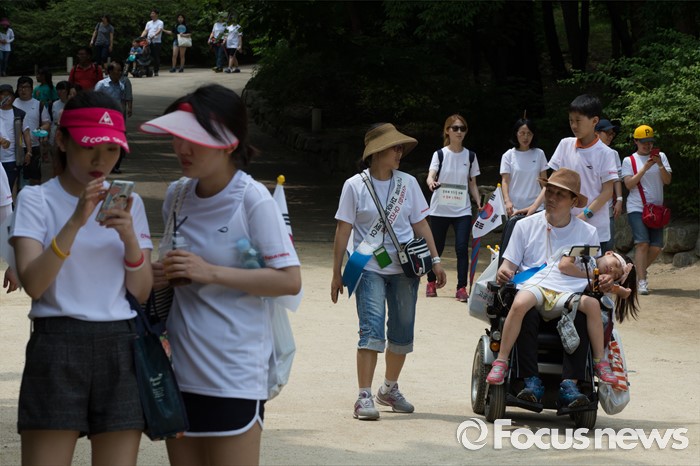 (서울=포커스뉴스) 12일 오전 서울 종로구 창경궁에서 '제7회 나라사랑 고궁걷기 대회'에 참가한 시민들이 고궁을 둘러보며 걷고 있다.
