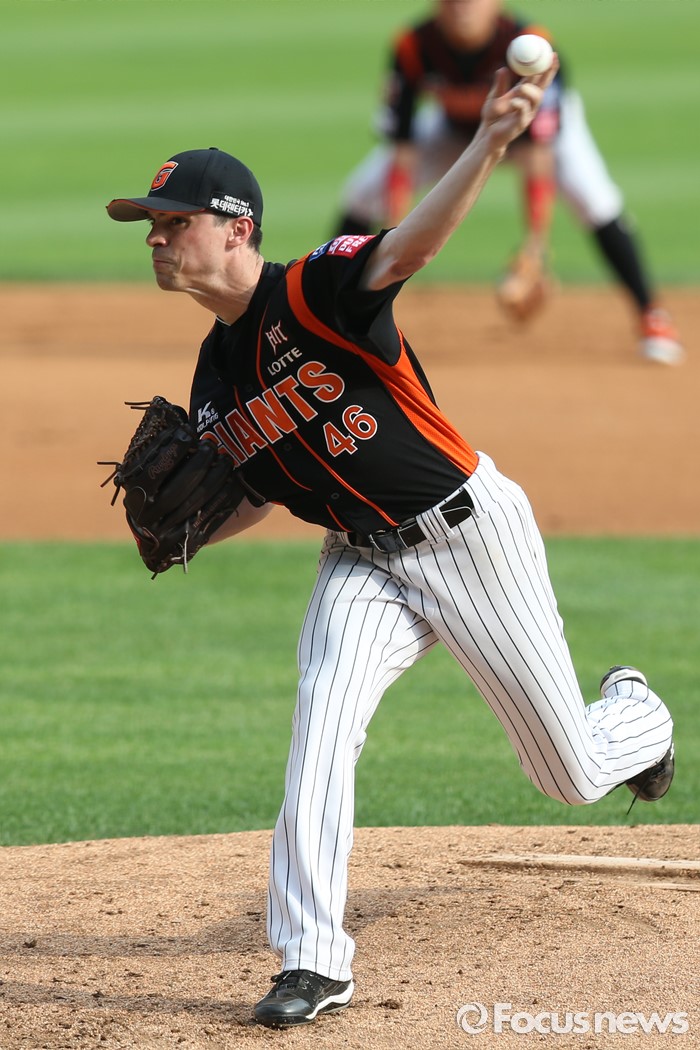 (서울=포커스뉴스) 12일 서울 잠실구장에서 열린 2016프로야구 롯데-두산 경기에서 1회말 롯데 선발투수 레일리가 투구하고 있다.