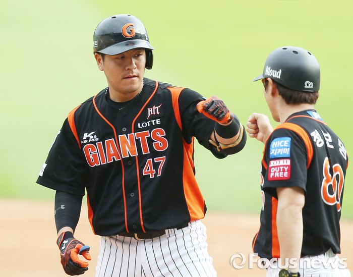 (서울=포커스뉴스) 12일 서울 잠실구장에서 열린 2016 프로야구 롯데-두산 경기 4회초 2사 2루에서 롯데 강민호가 2루주자 황재균을 불러 들이는 중전 안타를 치고 정보명 코치의 축하를 받고 있다.