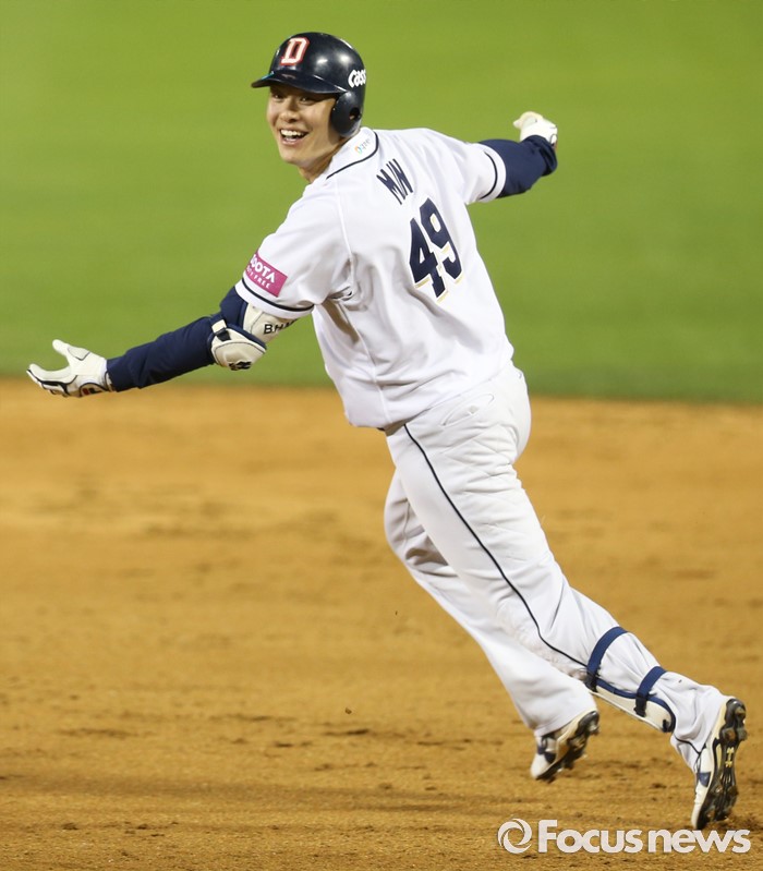 (서울=포커스뉴스) 12일 서울 잠실구장에서 열린 2016 프로야구 롯데-두산 경기에서 연장 11회말 끝내기 2루타를 친 두산 민병헌이 환호하며 뛰어 나가고 있다.