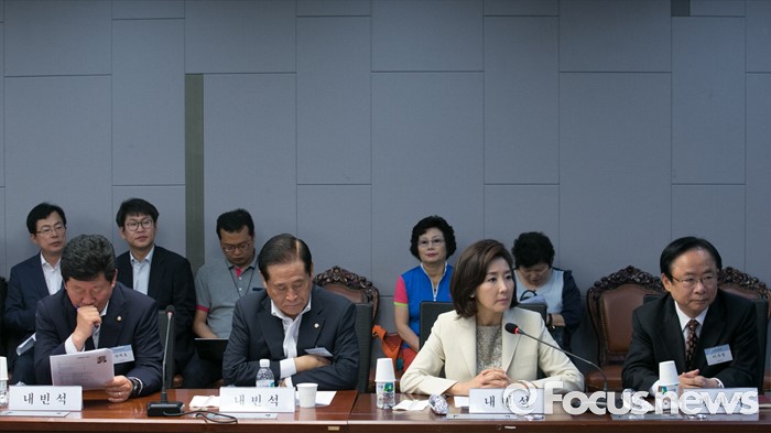 (서울=포커스뉴스) 13일 오전 서울 여의도 국회 의원회관에서 '개헌, 우리 시대의 과제'란 주제로 열린 14차 국가전략포럼에 참석한 의원들이 인명진 목사의 발언을 듣고 있다. 왼쪽부터 박재호 더불어민주당 의원, 배덕광, 나경원, 이주영 새누리당 의원.