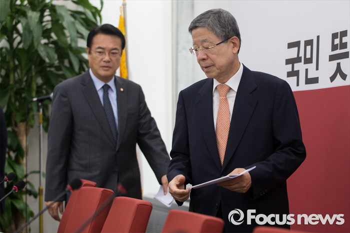 (서울=포커스뉴스) 김희옥(오른쪽) 새누리당 비상대책위원장이 13일 오전 서울 여의도 국회에서 열린 혁신비상대책위원회의에 참석하고 있다.