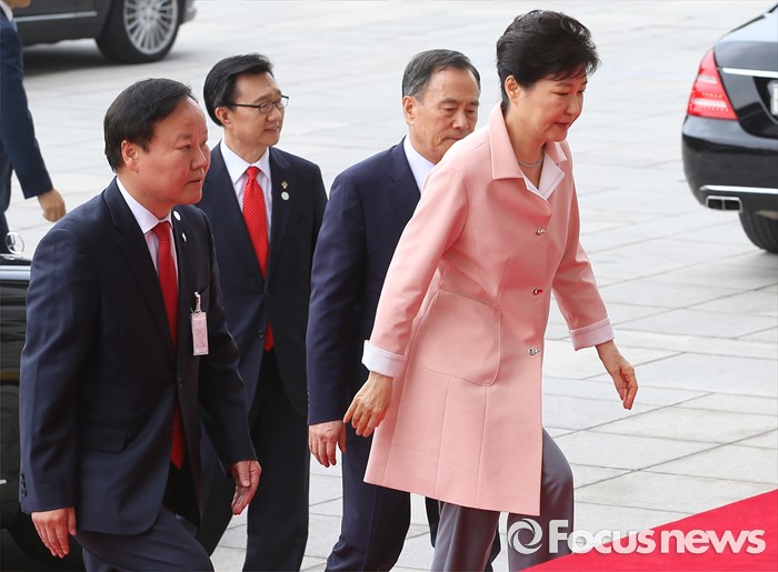 (서울=포커스뉴스) 박근혜 대통령이 13일 오전 서울 여의도 국회에서 열린 20대 국회 개원식 연설을 위해 본청으로 들어서고 있다.