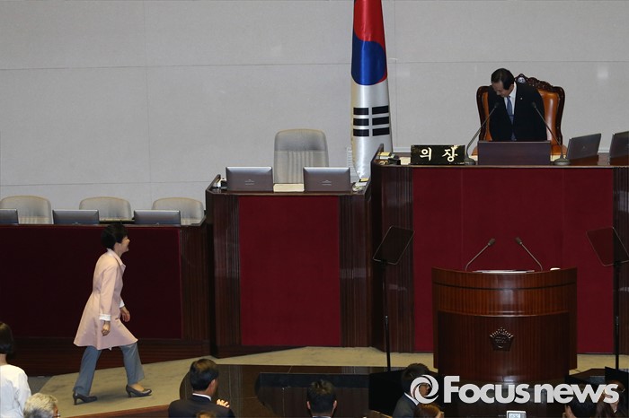 (서울=포커스뉴스) 13일 오전 서울 여의도 국회에서 열린 20대 국회 개원식에 박근혜 대통령이 연설을 위해 단상을 오르고 있다.
