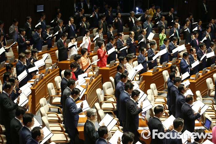 (서울=포커스뉴스) 13일 오전 서울 여의도 국회에서 열린 20대 국회 개원식에 참석한 의원들이 선서를 하고 있다.
