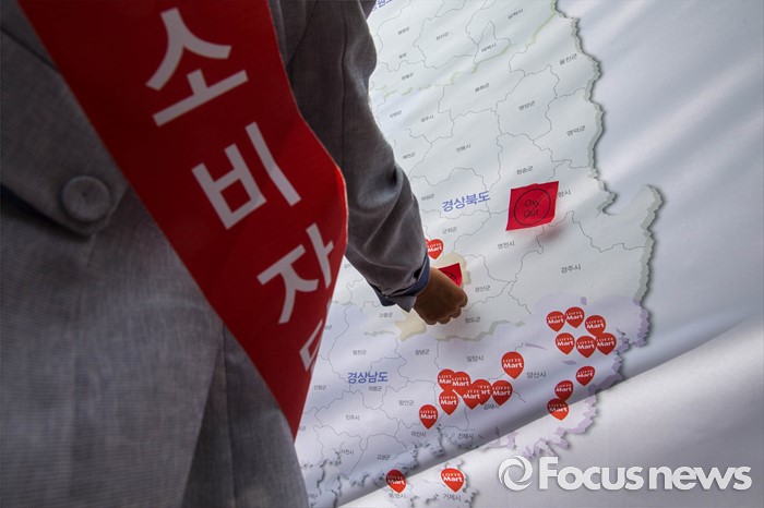 (서울=포커스뉴스) 13일 오전 서울 용산구 롯데마트 서울역점 앞에서 소비자단체 회원들이 롯데마트의 자사 가습기 살균제품 피해에 대한 책임있는 행동을 촉구하고 옥시 제품 판매 중단을 요구하는 집회를 하고 있다.