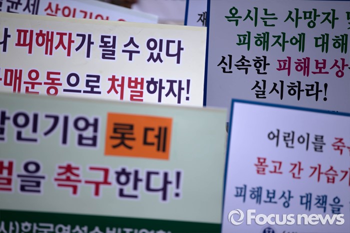 (서울=포커스뉴스) 13일 오전 서울 용산구 롯데마트 서울역점 앞에서 소비자단체 회원들이 롯데마트의 자사 가습기 살균제품 피해에 대한 책임있는 행동을 촉구하고 옥시 제품 판매 중단을 요구하는 집회를 하고 있다.