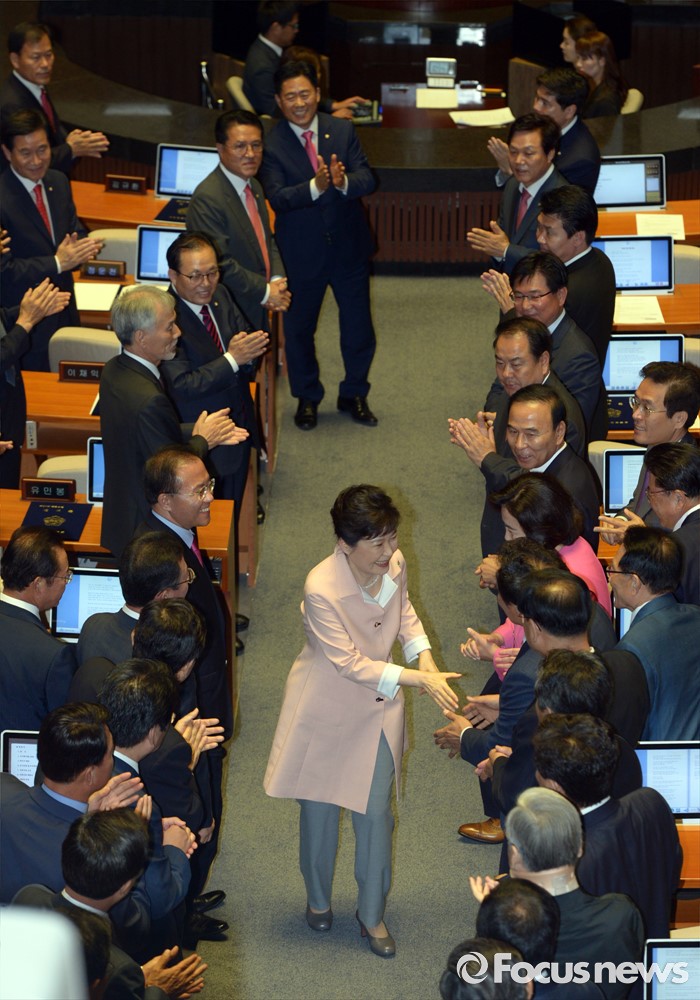 (서울=포커스뉴스) 박근혜 대통령이 13일 오전 서울 여의도 국회에서 열린 20대 국회 개원식에 참석해 연설을 마친 뒤 퇴장하며 의원들과 인사하고 있다.