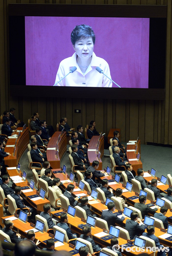 (서울=포커스뉴스) 박근혜 대통령이 13일 오전 서울 여의도 국회에서 열린 20대 국회 개원식에 참석해 연설을 하고 있다.