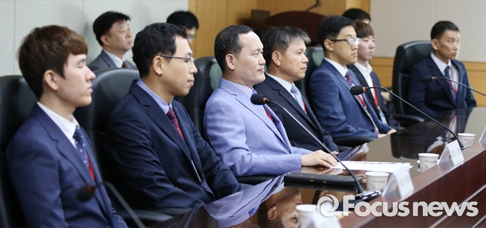(세종=포커스뉴스) 13일 오전 세종시 정부세종청사 해수부 중회의실에서 열린 아라온호 승조원 격려 및 간담회에서 승조원들이 윤학배 해양수산부 차관의 발언을 듣고 있다.