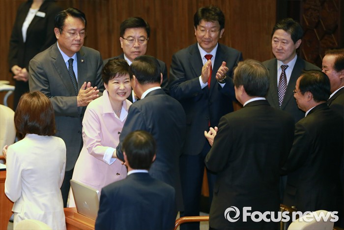 (서울=포커스뉴스) 박근혜 대통령이 13일 오전 서울 여의도 국회에서 열린 20대 국회 개원식에 참석해 연설을 마친 뒤 퇴장하며 의원들과 인사하고 있다.