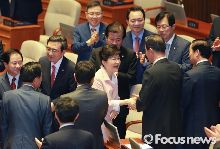 (서울=포커스뉴스) 박근혜 대통령이 13일 오전 서울 여의도 국회에서 열린 20대 국회 개원식에 참석해 연설을 마친 뒤 퇴장하며 의원들과 인사하고 있다.