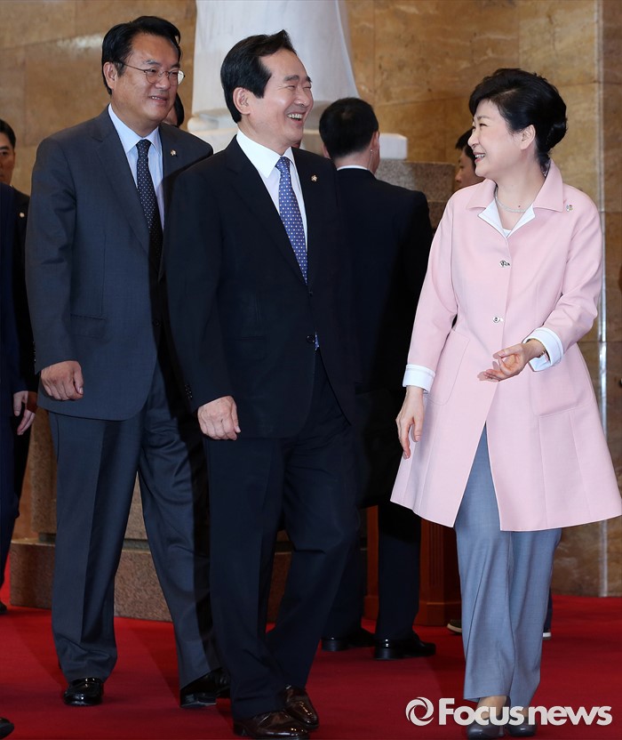 (서울=포커스뉴스) 박근혜(오른쪽) 대통령이 13일 오전 서울 여의도 국회에서 열린 20대 국회 개원식에 참석해 여야 지도부 및 5부 요인과 간담회를 가진 뒤 정세균(가운데) 국회의장의 배웅을 받으며 나서고 있다. 왼쪽은 정진석 새누리당 원내대표.