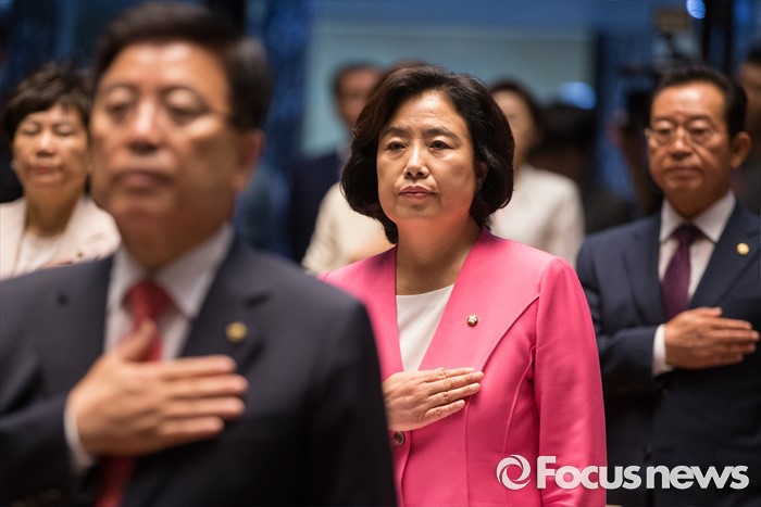 (서울=포커스뉴스) 박순자 새누리당 의원이 13일 오전 서울 여의도 국회에서 열린 의원총회에 참석해 국기에 대한 경례를 하고 있다.