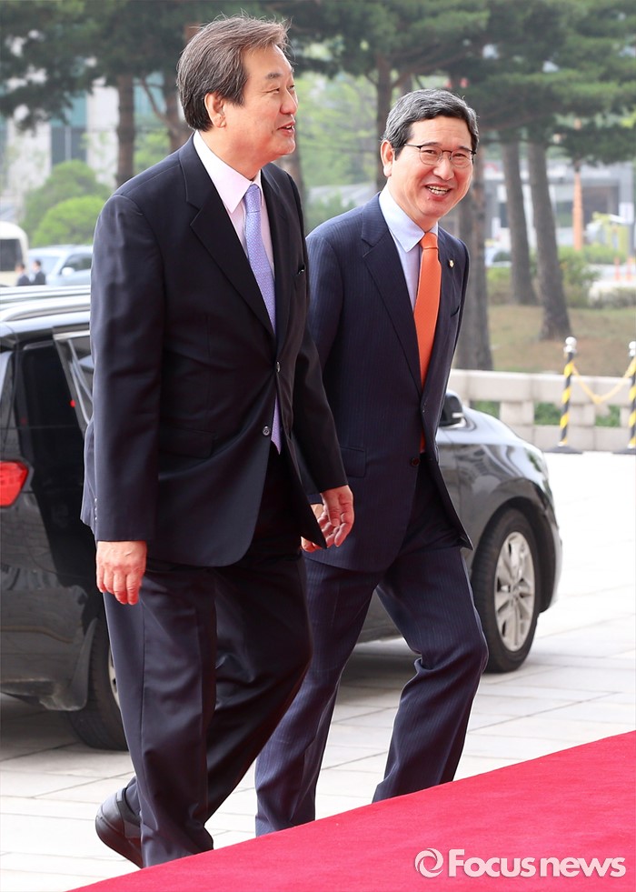(서울=포커스뉴스) 김무성(왼쪽) 새누리당 전 대표와 김학용 의원이 13일 오전 서울 여의도 국회에서 열린 20대 국회 개원식에 참석하고 있다.