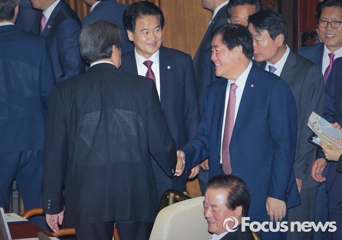 (서울=포커스뉴스) 김무성(왼쪽) 새누리당 전 대표와 최경환 의원이 13일 오전 서울 여의도 국회에서 열린 20대 국회 개원식에 참석해 인사하고 있다.