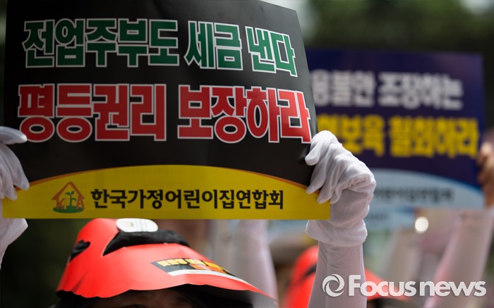 (서울=포커스뉴스) 13일 오후 서울 여의도 KB국민은행 앞에서 한국가정어린이집연합회 회원들이 맞춤형 보육 저지와 누리과정 예산 해결 및 평등지원 촉구 결의대회를 하고 있다.