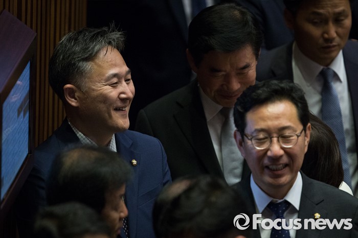 (서울=포커스뉴스) 13일 오후 서울 여의도 국회에서 상임위원장 선출을 위해 열린 343회 국회(임시회) 2차 본회의에 참석한 표창원 더불어민주당 의원이 의원들과 대화하며 웃고 있다.