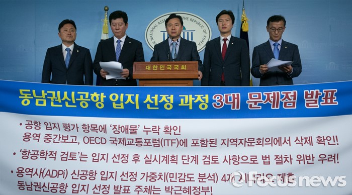 (서울=포커스뉴스) 13일 오후 서울 여의도 국회 정론관에서 더불어민주당 부산지역 의원들이 동남권 신공항 입지 선정 과정 문제점 발표 기자회견을 하고 있다. 왼쪽부터 최인호, 박재호, 김영춘, 김해영, 전재수 의원.