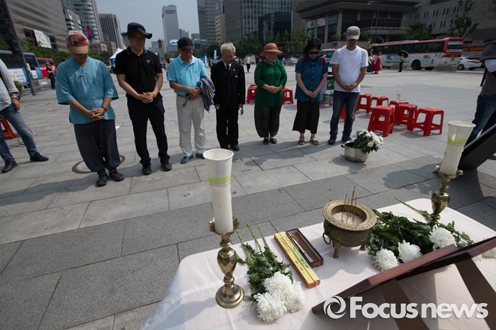 (서울=포커스뉴스) 2002년 미군 궤도차량에 치여 숨진 고(故) 신효순·심미선 양 14주기인 13일 오후 서울 종로구 광화문 광장에 마련된 분향소에서 참가자들이 헌화 후 묵념을 하고 있다.