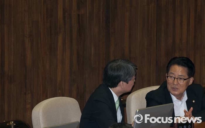 (서울=포커스뉴스) 13일 오후 서울 여의도 국회에서 상임위원장 선출을 위해 열린 343회 국회(임시회) 2차 본회의에 참석한 안철수(왼쪽) 국민의당 상임공동대표와 박지원 원내대표가 대화하고 있다.