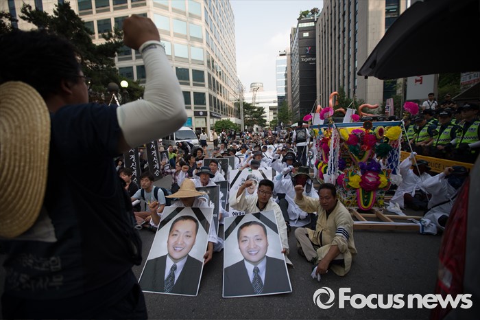 (서울=포커스뉴스) 13일 오후 유성기업 노동자 故 한광호씨의 분향소를 양재동 현대차 본사 앞으로 옮기는 꽃길 100리 행진에 참여한 노동자들이 시청 분향소에서 출발해 국회로 행진하던 중 더불어 민주당 당사 앞에 멈춰 집회를 하고 있다.