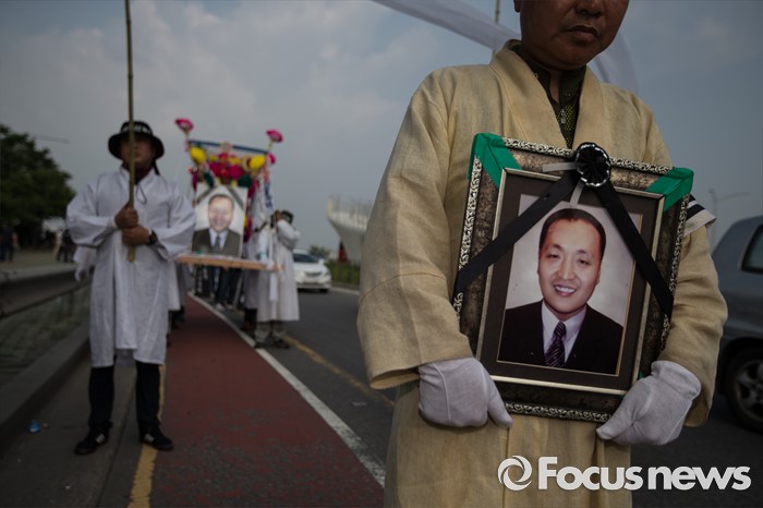 (서울=포커스뉴스) 13일 오후 유성기업 노동자 故 한광호씨의 분향소를 양재동 현대차 본사 앞으로 옮기는 꽃길 100리 행진에 참여한 노동자들이 시청 분향소를 떠나 국회를 향하고 있다.