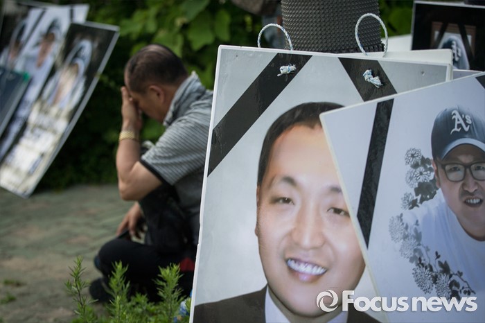 (서울=포커스뉴스) 13일 오후 유성기업 노동자 故 한광호씨의 분향소를 양재동 현대차 본사 앞으로 옮기는 꽃길 100리 행진에 참여한 어느 한 노동자가 故 한광호씨의 영정사진 앞에서 슬픔에 잠겨 있다.