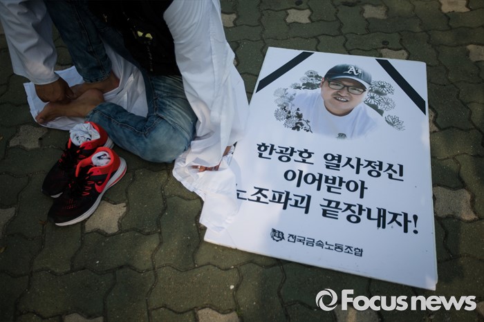 (서울=포커스뉴스) 13일 오후 유성기업 노동자 故 한광호씨의 분향소를 양재동 현대차 본사 앞으로 옮기는 꽃길 100리 행진에 참여한 노동자들이 시청 분향소를 떠나 국회를 향하던 중 잠시 휴식을 취하고 있다.