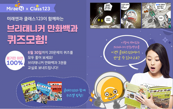 (서울=포커스뉴스) 미래엔 아이세움은 무료 인터넷 학급 경영 도구 클래스123과 함께 초등학생 대상 '브리태니커 만화 백과' 퀴즈 서비스를 13일 오픈했다.