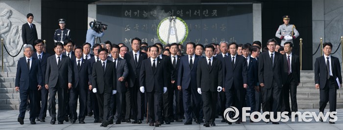 (서울=포커스뉴스) 정세균 국회의장과 정진석 새누리당 원내대표, 우상호 더불어민주당 원내대표, 박지원 국민의당 원내대표, 20대 국회 전반기 상임위원장들이 14일 오전 동작구 국립서울현충원을 방문해 참배를 마친 뒤 이동하고 있다.