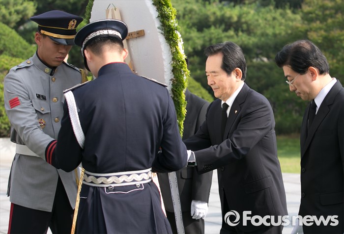 (서울=포커스뉴스) 정세균 국회의장이 14일 오전 동작구 국립서울현충원을 방문해 여야 3당 원내대표, 20대 국회 전반기 상임위원장단과 함께 참배에 앞서 헌화를 하고 있다.