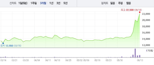 1달 전 주가인 5월13일(1만3450원)과 비교했을 때 65.05% 상승한 수치다.