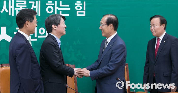(서울=포커스뉴스) 안철수(왼쪽 두번째) 국민의당 상임공동대표, 천정배(왼쪽 첫번째) 공동대표가 14일 오전 서울 여의도 국회를 방문한 이원종(오른쪽 두번째) 대통령비서실장, 김재원 청와대 정무수석과 인사하고 있다.