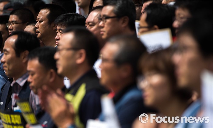 (서울=포커스뉴스) 14일 오전 서울 종로구 세종문화회관 앞에서 양대노총 공공부문공대위가 주최하는 '성과연봉제 중단 촉구 및 공공기관장 워크숍 규탄 기자회견'이 열리고 있다.