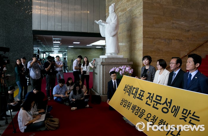 (서울=포커스뉴스) 노회찬 정의당 원내대표와 의원들이 14일 오전 서울 여의도 국회 로텐더홀 계단 앞에서 상임위 배정과 관련 기자회견을 하고 있다. 왼쪽부터 이정미 원내수석부대표, 추혜선 의원, 노 원내대표, 윤소하 의원.