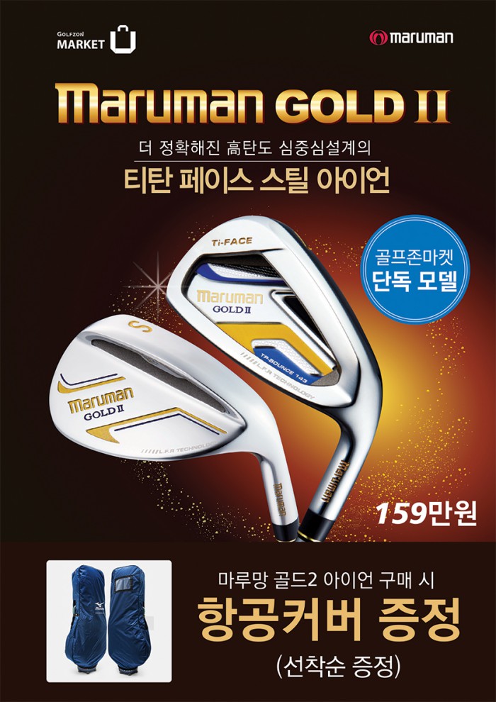 마루망골드2 스틸아이언의 가격은 159만원이며, 전국 골프존마켓 매장에서 시타와 구매가 가능하다. 제품 구매자 선착순 50명에겐 6만원 상당의 항공커버를 무료 증정한다.골프존마켓의 '마루망골드2' 스틸아이언 단독 판매를 알리는 포스터.<사진제공=골프존유통>