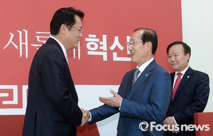 (서울=포커스뉴스) 정진석(왼쪽) 새누리당 원내대표가 14일 오전 서울 여의도 국회를 방문한 이원종(가운데) 대통령비서실장, 김재원 청와대 정무수석과 인사하고 있다.