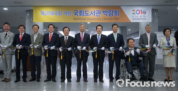(서울=포커스뉴스) 정세균(오른쪽 다섯번재) 국회의장과 천정배(오른쪽 네번째) 국민의당 공동대표가 14일 오전 서울 여의도 국회 의원회관에서 열린 국회도서관 박람회 개막식에 참석해 이은철(오른쪽 여섯번째) 국회도서관 관장과 함께 컷팅식을 하고 있다. 왼쪽은 표창원 더불어민주당 의원.