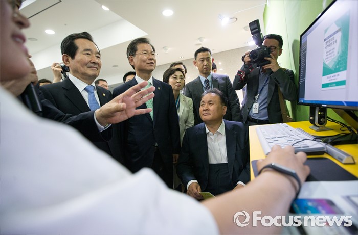 (서울=포커스뉴스) 정세균(왼쪽 두번째) 국회의장과 천정배(왼쪽 세번째) 국민의당 공동대표가 14일 오전 서울 여의도 국회 의원회관에서 열린 국회도서관 박람회 개막식에 참석해 디지털화 된 국회도서관에 관한 설명을 듣고 있다.