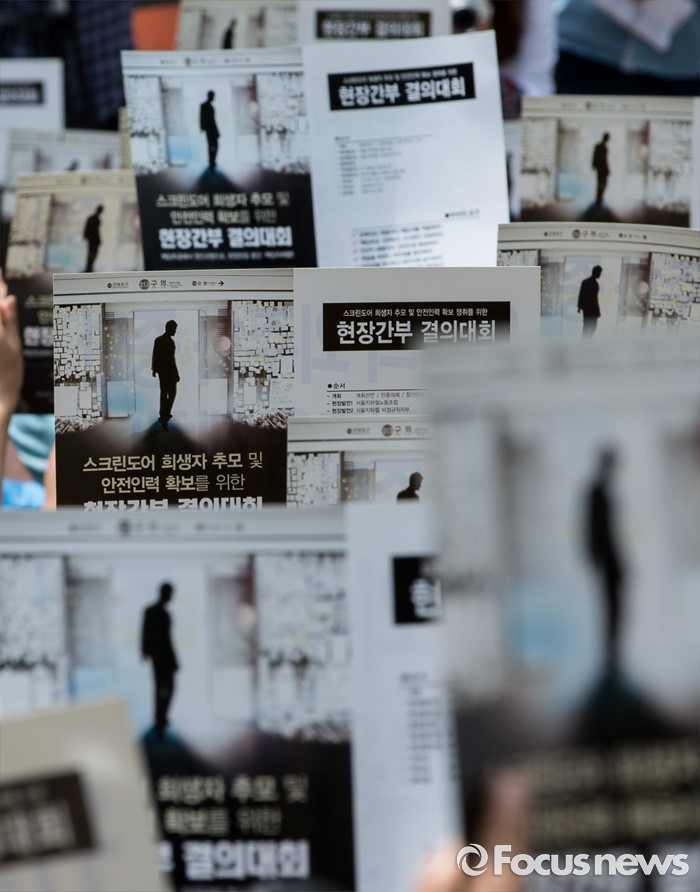 (서울=포커스뉴스) 14일 오전 서울시청 앞 인도에서 민주노총 공공운수노조와 서울지하철노조 관계자들이 스크린도어 희생자 추모 및 안전인력 확보를 위한 현장간부 결의대회를 하고 있다.